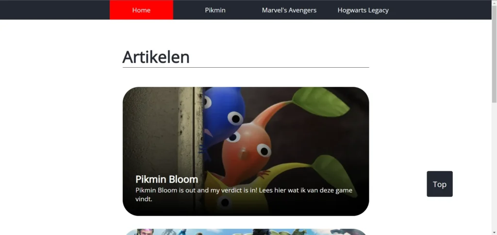 Dit individueel project toon een blogwebsite waar ik artikelen deel over games zoals Pikmin Bloom en Marvel’s Avengers. De website is responsive en heeft een strakke, moderne uitstraling.
